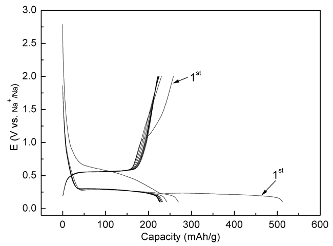 | Figure 2. The first 10 discharge-charge cycles of the Na2C8H4O4/KB composite electrode, the voltage range is between 0.1 V and 2 V. (Image by HU Yongsheng et al.) |