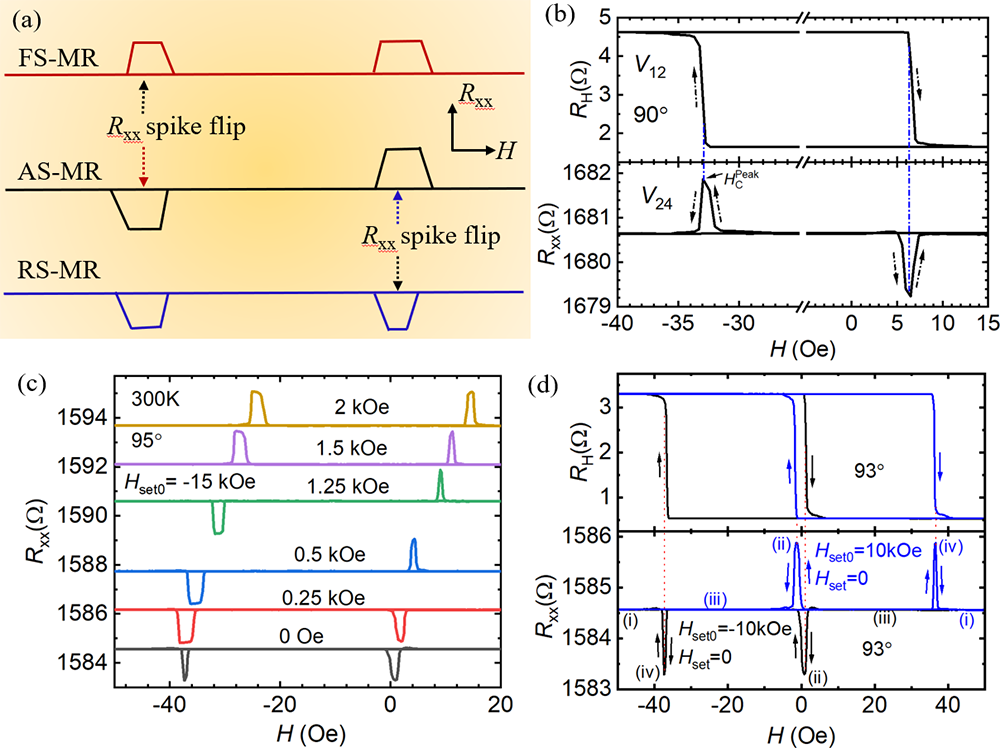 Figure 1:Schematic diagram of the magnetoresistance effect regulated by magnetic field symmetry and experimental observation results. (a) Schematic diagram of the principle of magnetoresistance effect regulated by magnetic field symmetry; (b) Asymmetric magnetoresistance (AS-MR) effect induced by the anomalous Hall effect; (c) Reversible switching among AS-MR, forward-symmetric magnetoresistance (FS-MR), and reverse-symmetric magnetoresistance (RS-MR) achieved via magnetic field symmetry by a tunable preset magnetic field; (d) Reversible switching between FS-MR and RS-MR.