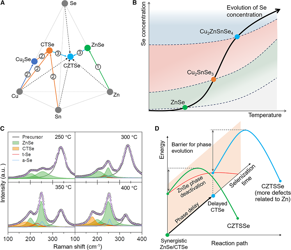 Most recently, the team reported the key strategies and techniques behind this record-breaking result. They first found, from the material preparation perspective, that unbalanced phase evolution during selenization crystallization of CZTSSe plays a key role in causing defect formations. Specifically, they showed that the formation of CZTSSe involves the combination between ZnSe and Cu₂SnSe₃ (CTSe); however, ZnSe forms earlier than CTSe during the reaction. This delay allows ZnSe to accumulate before CTSe appears. As ZnSe continues to grow, its reactivity decreases. That makes it harder for ZnSe and CTSe to react efficiently into the final CZTSSe phase, increasing the likelihood of Zn-related substitution defects such as SnZn and CuZn (Figure 1).
